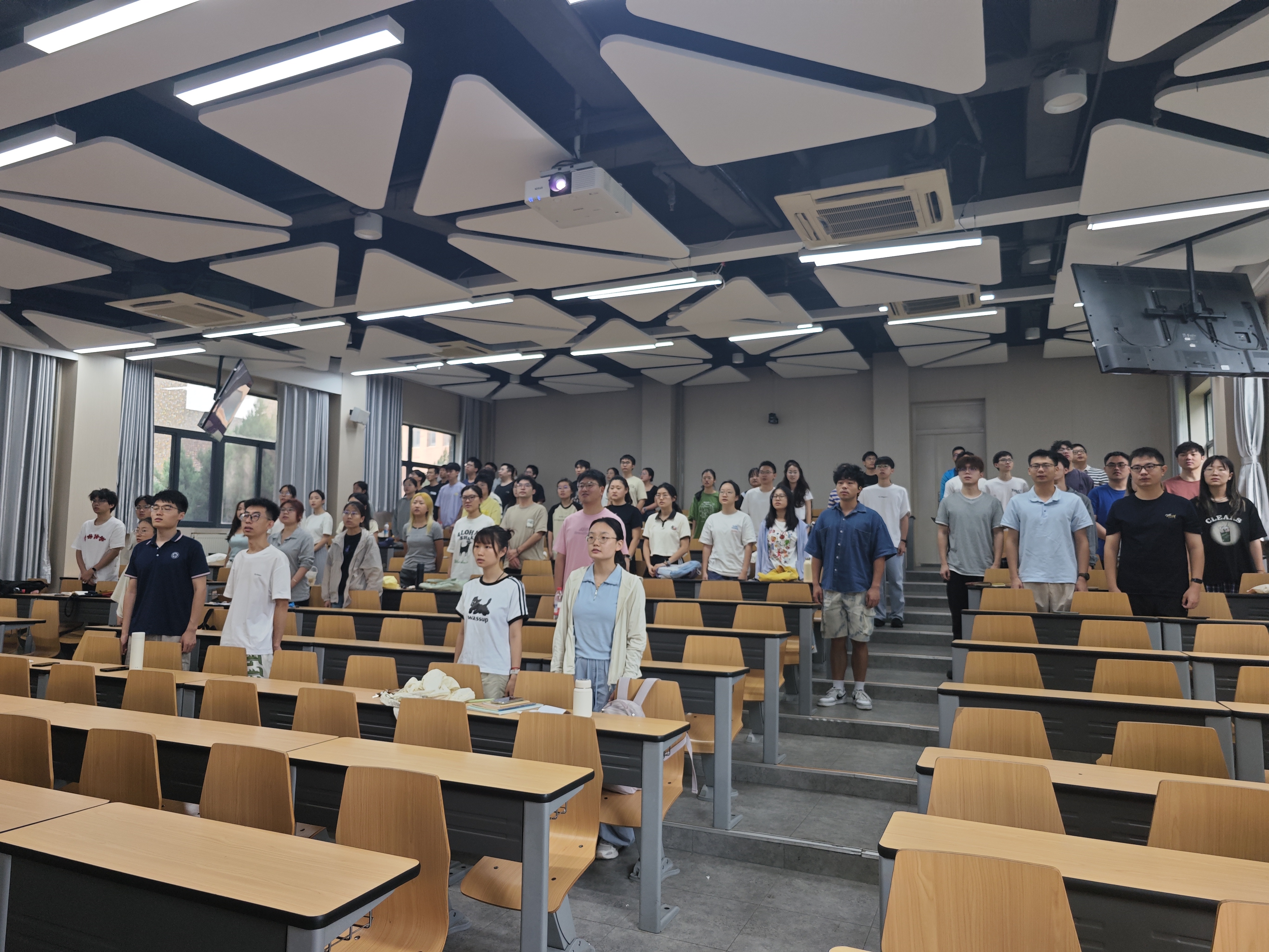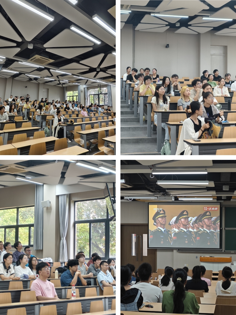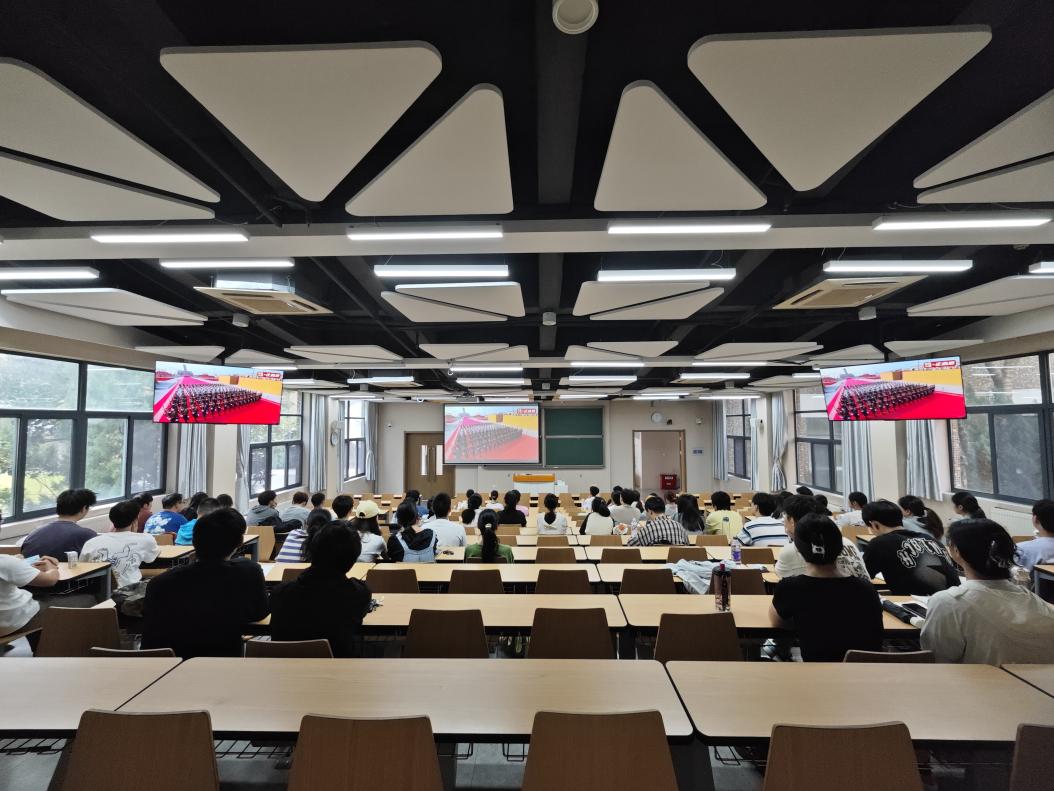 上午9时,阅兵仪式正式开始。庄严的天安门广场上,威武雄壮的受阅部队、精良先进的国防装备、翱翔蓝天的战机梯队,依次通过屏幕展现在同学面前,充分展现了国家强大的国防力量和新时代人民军队的昂扬风貌。观看现场气氛庄严肃穆,同学们全神贯注、心潮澎湃,一次次用热烈的掌声表达对人民军队的由衷敬意和对祖国繁荣昌盛的无比自豪。