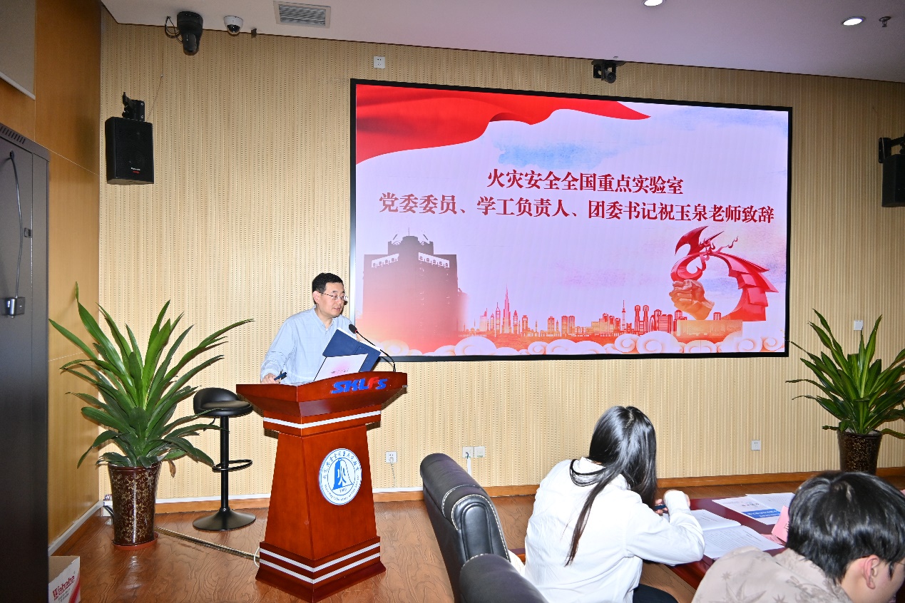 会议最后,火灾安全全国重点实验室党委委员、学生工作负责人、团委书记祝玉泉老师发表致辞。祝玉泉老师充分肯定实验室研究生会过去一年在学生服务、组织建设、活动开展等方面取得的扎实成效。他强调,研究生会要始终立足实验室发展大局,坚守服务师生的初心使命,聚焦同学所需、贴近师生期盼,打造真正受大家欢迎、让大家满意的品牌活动。要坚持以服务为根本宗旨,广泛倾听同学心声,精准对接发展需求,不断提升工作实效。他寄语全体研会成员牢记职责、严于律己,做到自重自省、自立自强,以勤勉务实、清正廉洁的优良作风,赢得广大同学的信任与支持,更好地发挥桥梁纽带作用。