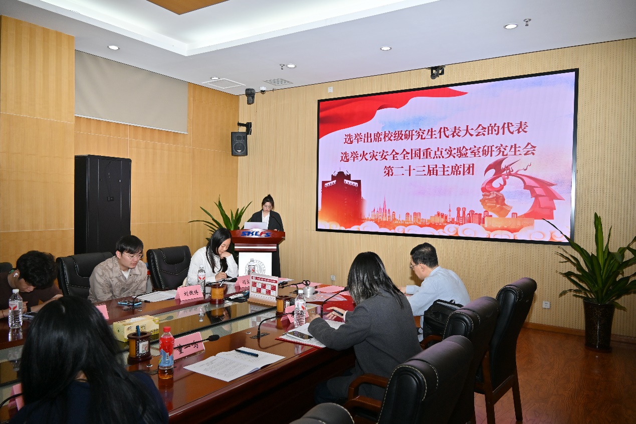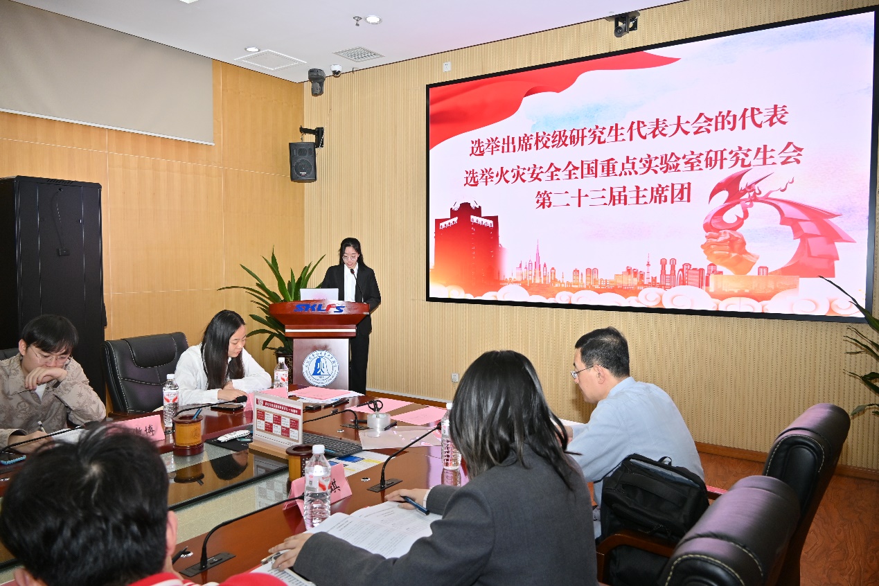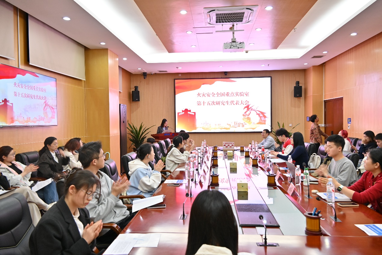 2026年4月8日晚7点,火灾安全全国重点实验室第十五次研究生代表大会在中国科学技术大学西区特种楼209会议室召开。火灾安全全国重点实验室党委委员、学生工作负责人、团委书记祝玉泉,火灾安全全国重点实验室团委学生副书记闫立梅,中国科学技术大学研究生会委员会委员孙雨琪,八位其他兄弟院系研究生会的代表以及实验室研究生代表出席。大会由实验室第二十二届研究生会主席团成员占燕萍同学主持。