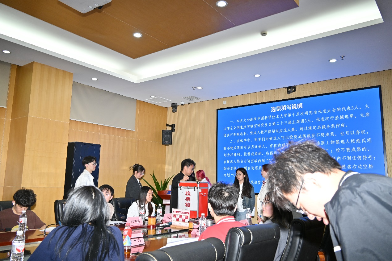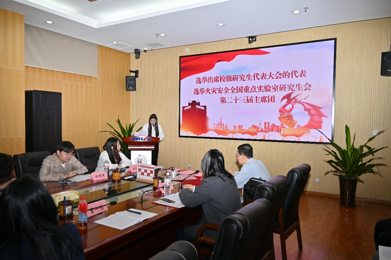大会第三项,审议并通过了《火灾安全全国重点实验室研究生代表大会选举办法》以及大会总监票人和总计票人名单。大会选举出席中国科学技术大学第十五次研究生代表大会的代表以及火灾安全全国重点实验室第二十三届研究生会主席团成员。各位候选人依次上台发表竞选演讲。